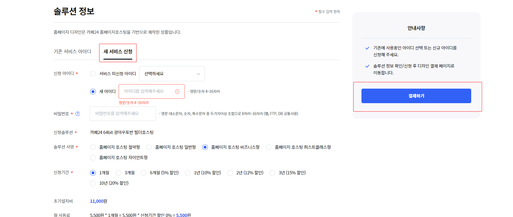 ¶Ç´Â »õ·Î¿î È£½ºÆÃÀ» ½ÅÃ»ÇØ¼­ ÀÛ¾÷À» ¿øÇÏ½Ç °æ¿ì¿¡´Â [»õ ¼­ºñ½º ½Åû]¿¡¼­ Á¤º¸¸¦ ÀÛ¼º ÈÄ Ä«µå °áÀç ÇÏ½Ã¸é µË´Ï´Ù.